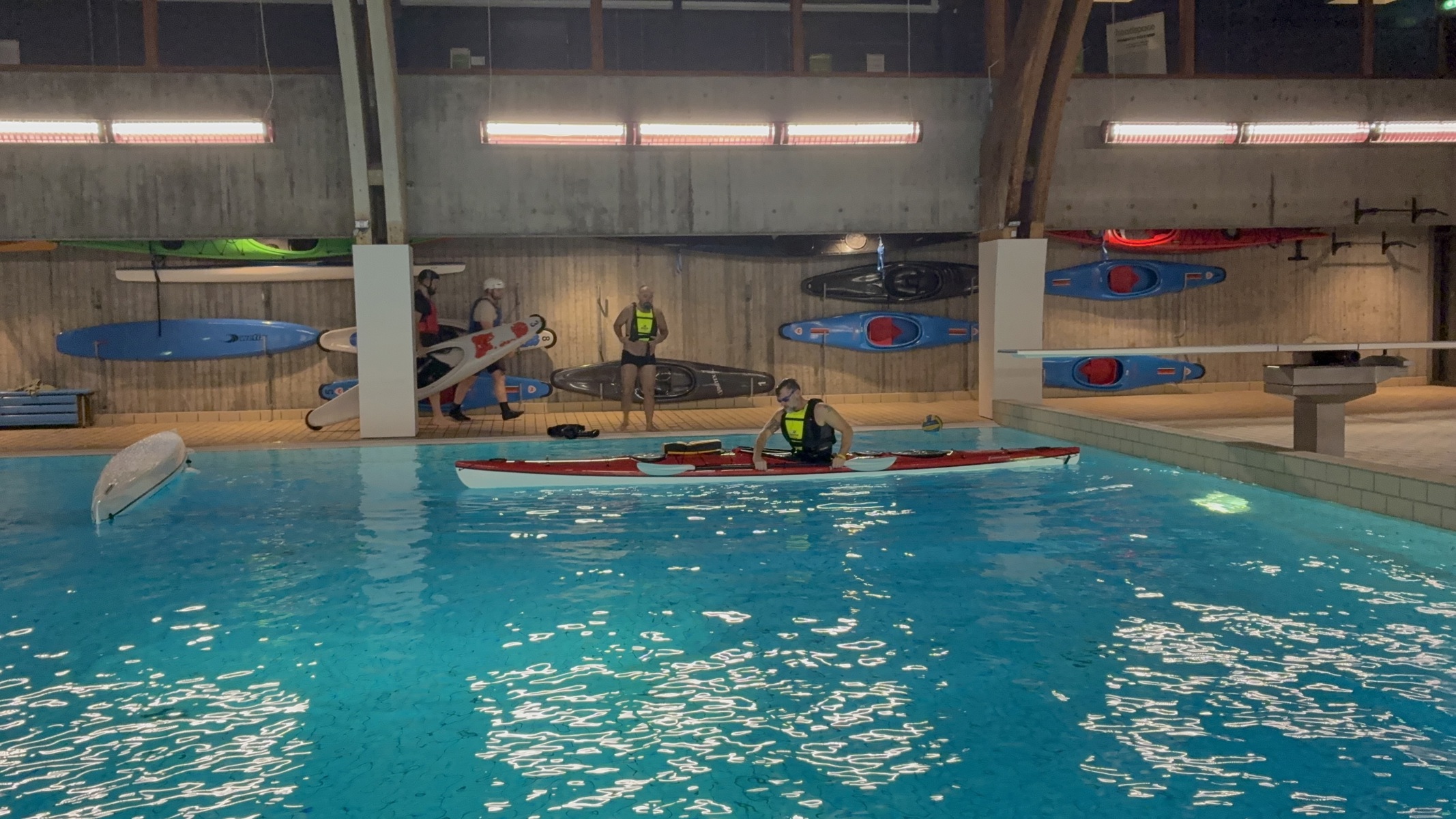 Vi mødes næste mandag kl. 20:30, vi er nu så rutinerede i, at bære kajakker og udstyr ind i svømmehallen, at det tager mindre end 15 min.