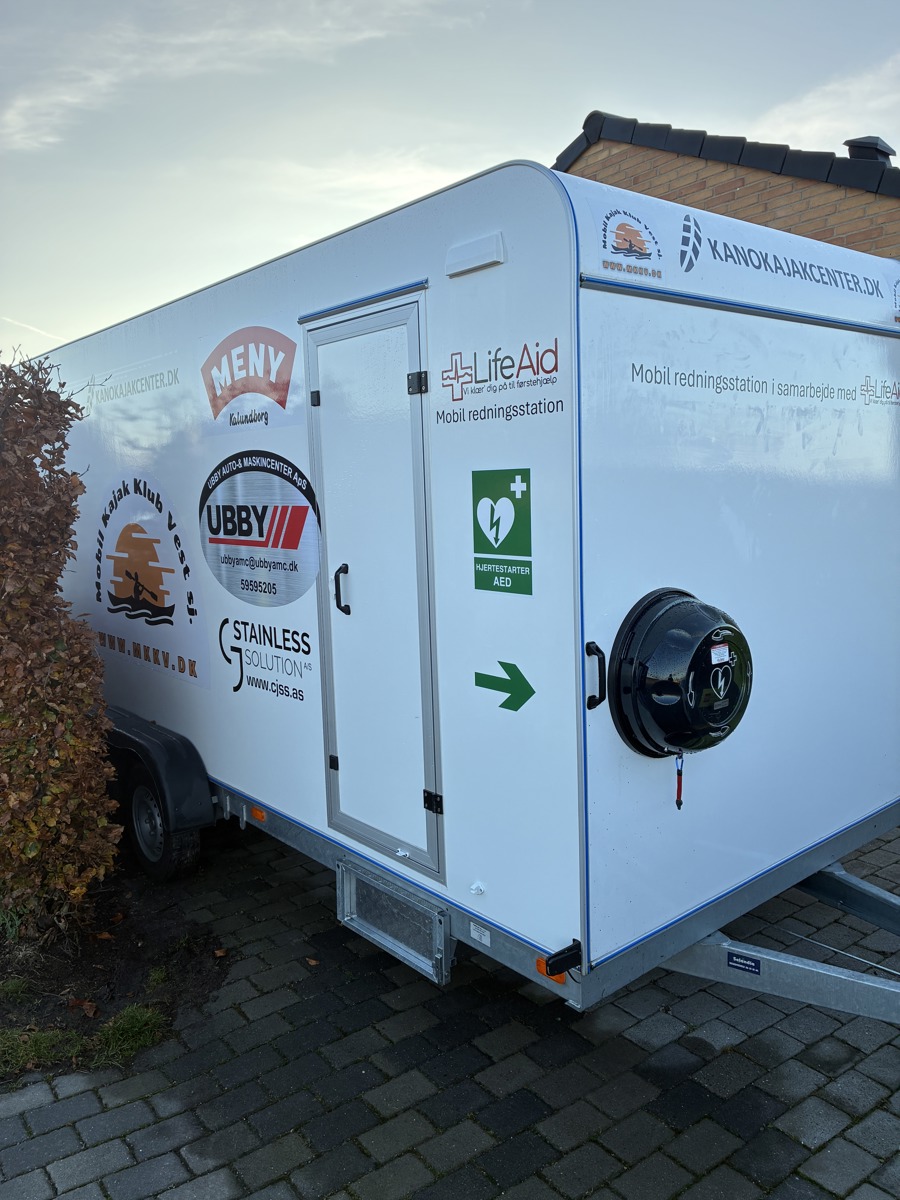 Hjertestarter og skiltning på plads på vores mobile klubhus, så nu fungerer det som mobil redningsstation i samarbejde med LifeAid.